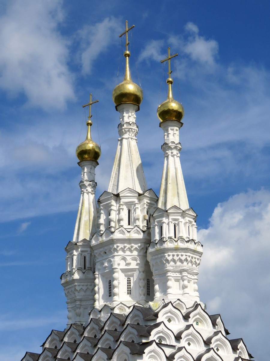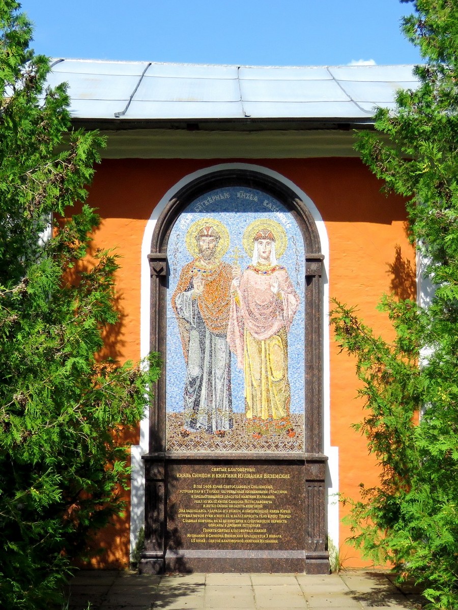 Трехшатровая церковь Одигитрии (1635-1638 гг. - дата также оспаривается) - незаурядный архитектурный памятник, являющийся лучшим украшением Вязьмы. Церковь редкой трехшатровой архитектуры (можно вспомнить, Успенскую "Дивную" церковь в Угличе, храм Рождества Богородицы в Путинках в Москве и Владимирскую церковь на Божедомке в Ярославле) представляет собой одностолпный четверик с рядами кокошников у основания шатров. Церковь перестраивалась после 1812 г., когда монастырь подвергся разорению. Серьезный ущерб храму нанесла и война 1941-45 гг. Ныне Одигитриевская церковь восстановлена в первоначальных формах: разобраны позднейшие пристройки, реставрированы ряды кокошников.